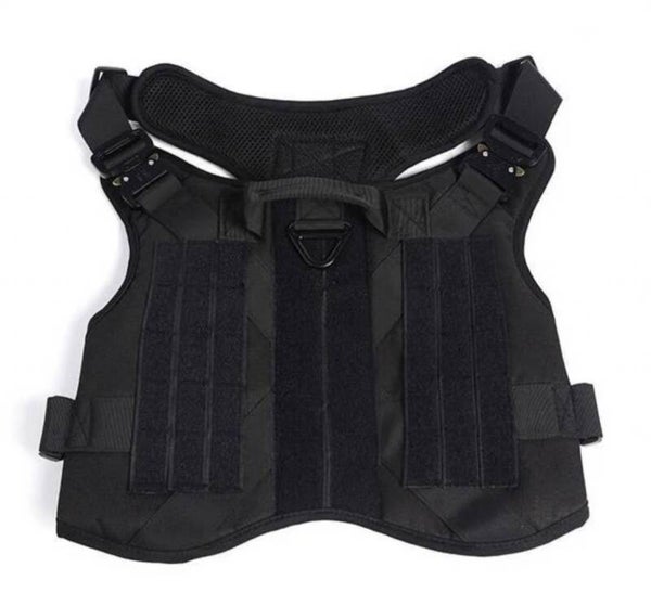 Het harnas heeft vier sluitingen, waaronder twee metalen Cobra Buckles, en twee “D” ringen voor veelzijdige bevestigingsopties. Het biedt ook plaatsen voor patches en een handvat voor extra controle.